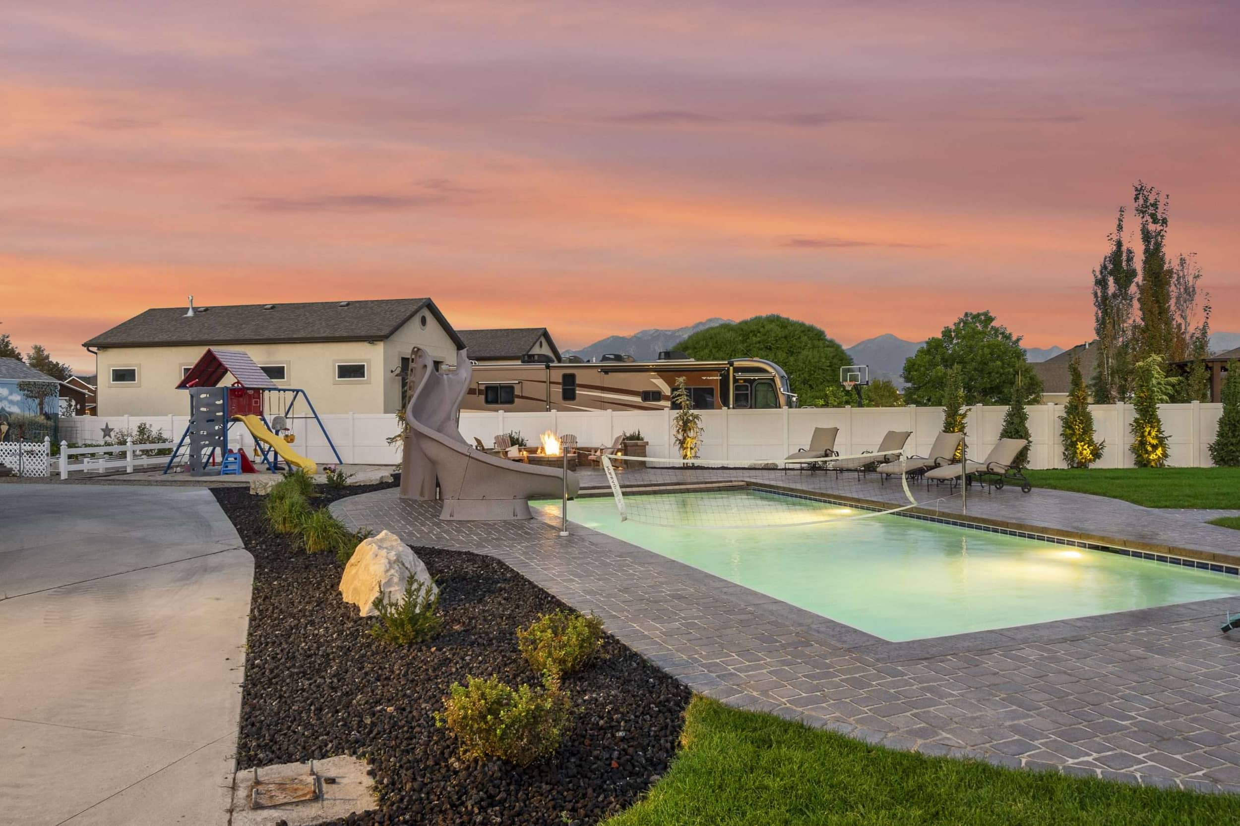 The pool at sunset — in-ground slide, paver deck, lounge chairs, playground, and fire pit glow with the Wasatch Range silhouetted beyond.